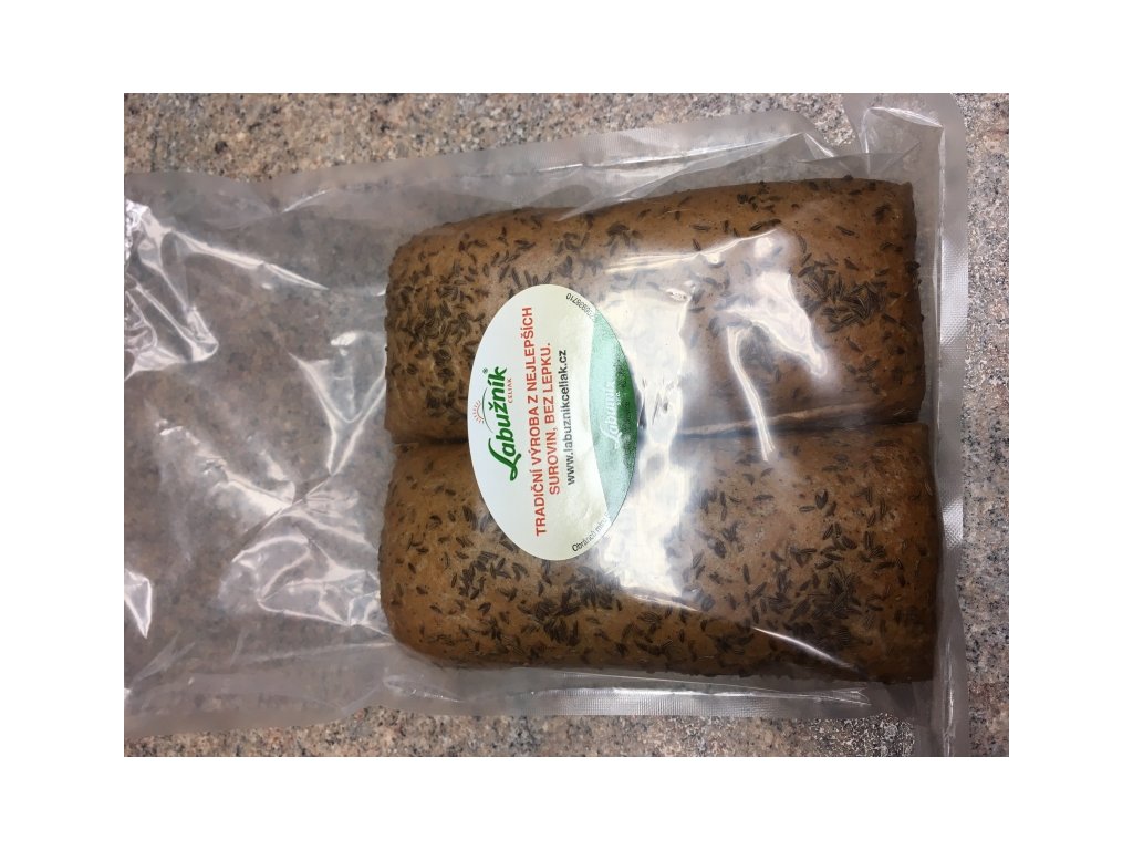 Složení: bezlepková směs(deproteinovaný pšeničný škrob, rýžová mouka, celozrnná pohanková mouka(3,9%), sójová mouka odtučněná, zahušťovadla( xanthan, tarra guma)), droždí, rostlinný olej-100% řepkový, sůl, cukr, kmín, karamel.
