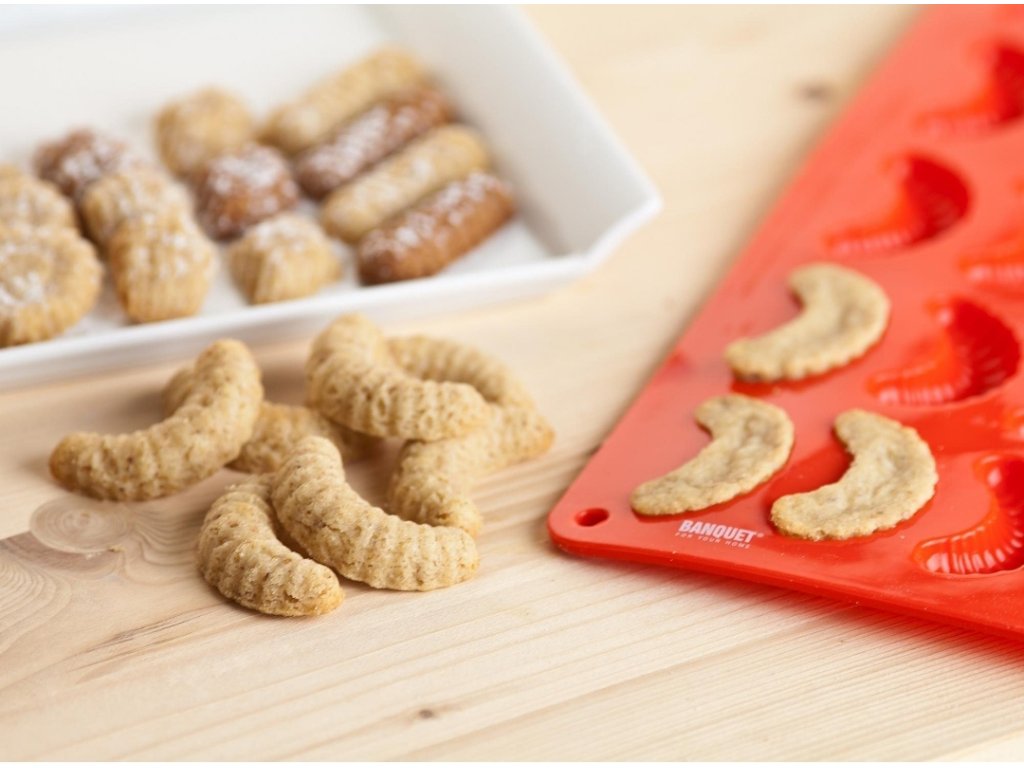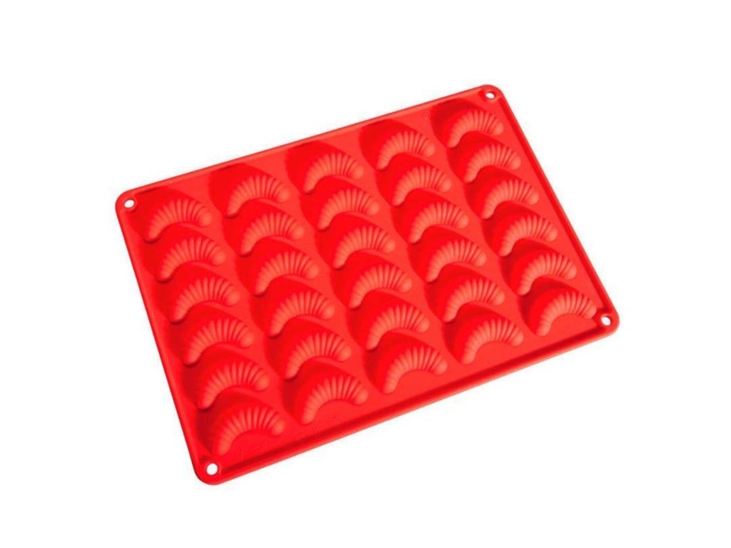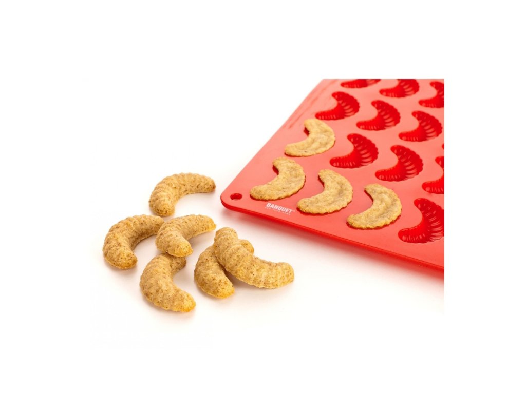 Silikonová forma na rohlíčky, odolná vysokým teplotám, až do 230°, lze ji používat do mikrovlnné trouby a myčky na nádobí, neváže chutě ani pachy pokrmů ,snadná údržba.