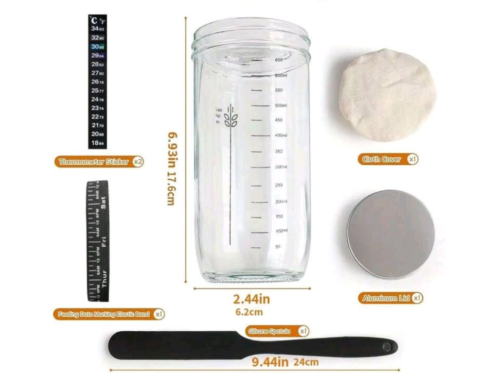 Každá sklenice je opatřena víkem a plátěným víčkem pro odvod plynů, proužkem jako značkou a kroužkem pro sledování kynutí těsta.