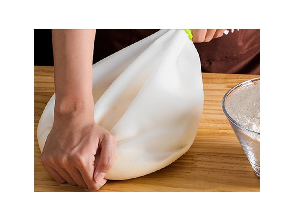 Silikonový vak pojme až 1 - 1,5 kg mouky, lze tedy zpracovávat i objemnější množství těsta. Díky měkkosti materiálu lze směs důkladně zpracovat. Velká tepelná odolnost dovolí dát chladit těsto do ledničky či mrazáku stejně jako nechat kynout v teplém prostřední, aniž byste jej museli vyndávat z vaku. Samotná hmota se na silikonový materiál nelepí, lze jej tedy snadno vyklopit.