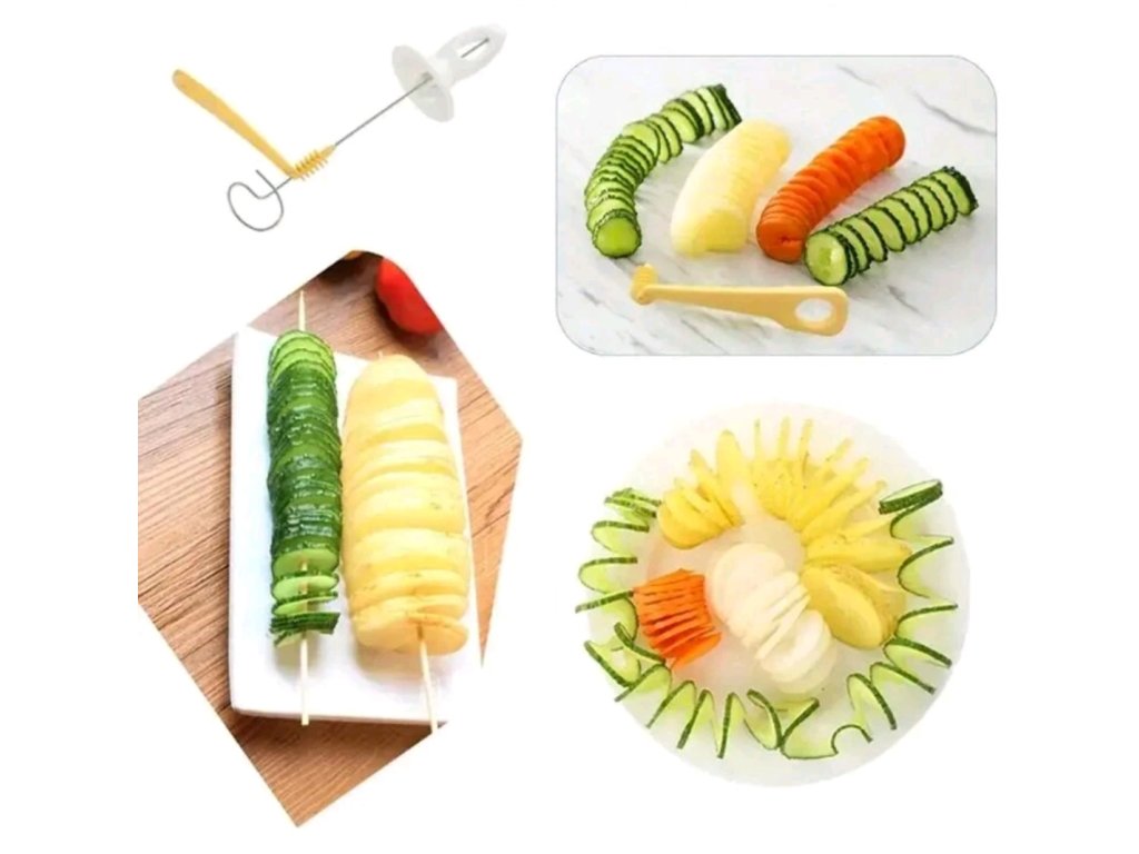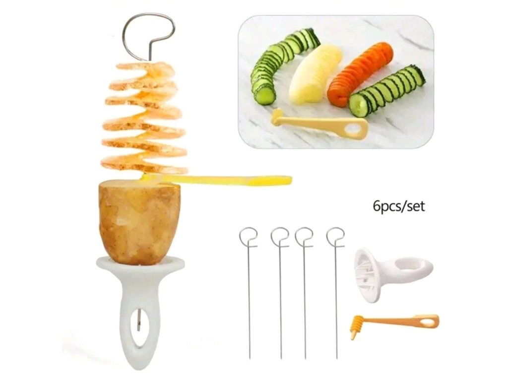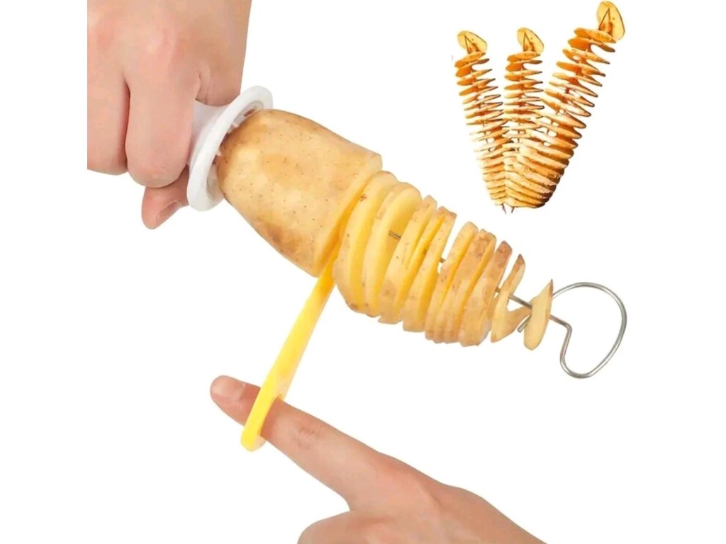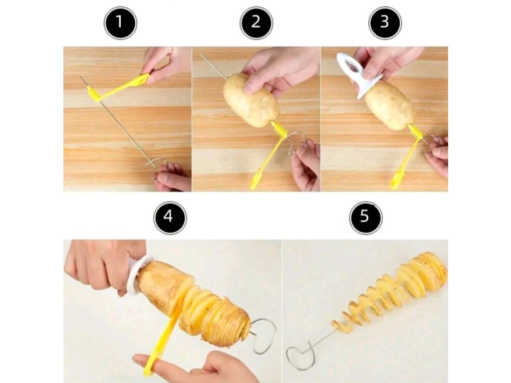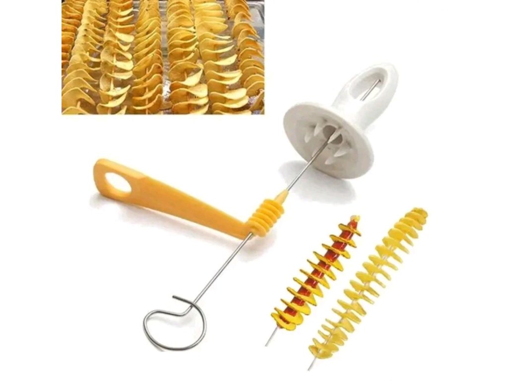Spirálový kráječ z nerezové oceli slouží pro domácí přípravu bramborových spirál. Milovníci domácích chipsů a hranolek zbystřete! Tento kráječ nabízí možnost, jak si v pohodlí domova nachystat křupavé bramborové spirály, bez připálených olejů a za minimální cenu. Sada obsahuje jeden spirálový kráječ s rukojetí a čtyři jehlice pro pečení nebo smažení bramborových spirál.